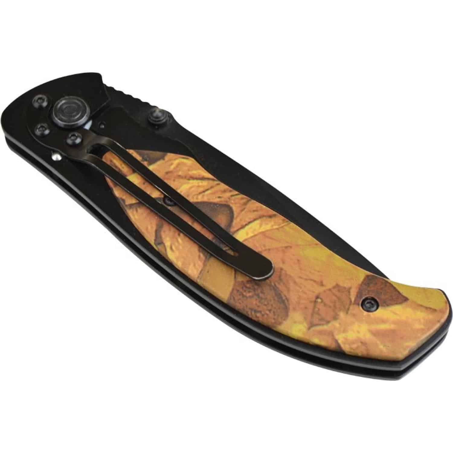 Camo handle and black oxidized Stainless Steel blade. Includes Nylon carry pouch and Stainless Steel attached clip Thumb notches at base of the blade becomes an easy one handed opening. 1.25″ D x 4.75″ W x 0.625″ H