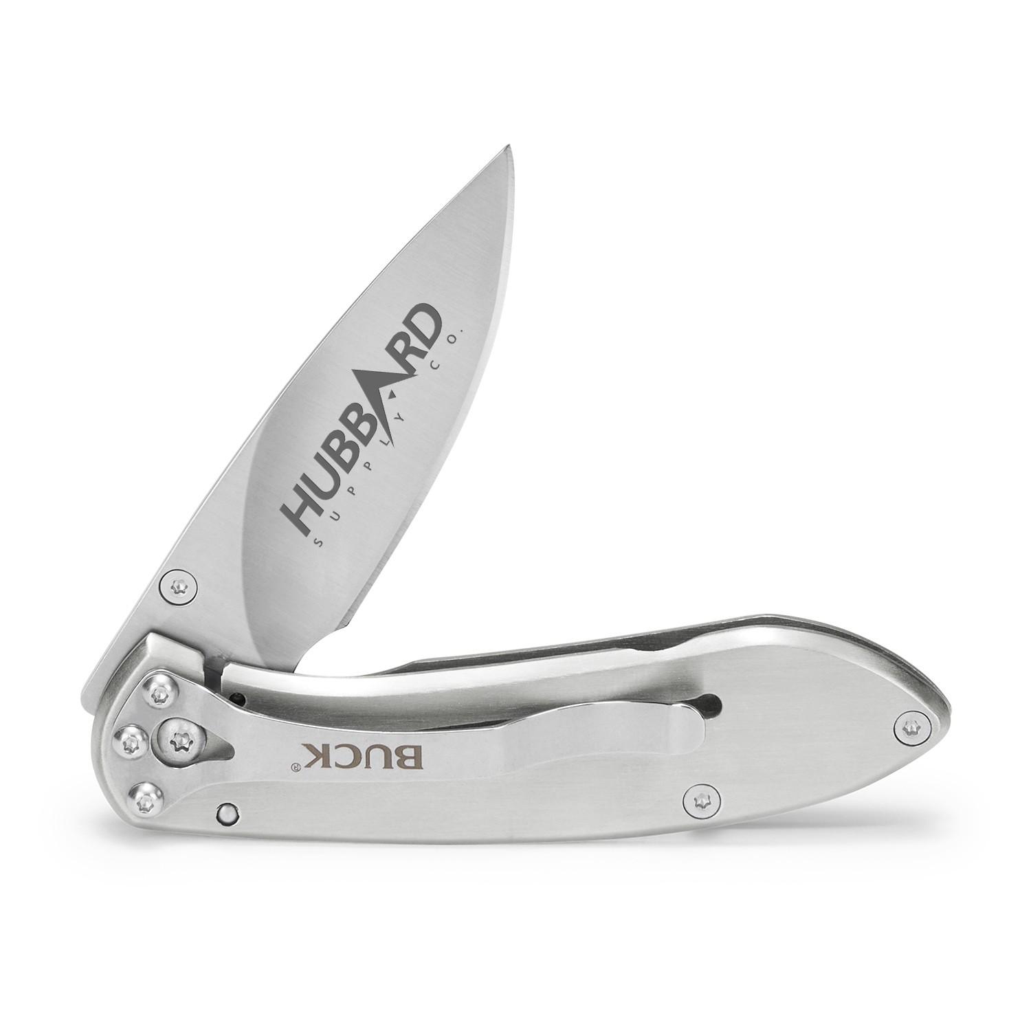 The Buck Nobleman is an elegantly sculpted, slimline, frame-lock knife. Featuring a 3.75″ brushed stainless-steel handle and a 2.6″ satin finish blade. One-hand deployment and liner locking mechanism. Comes with clip. Laser engrave on handle or blade. Boxed. Complies with Prop 65.