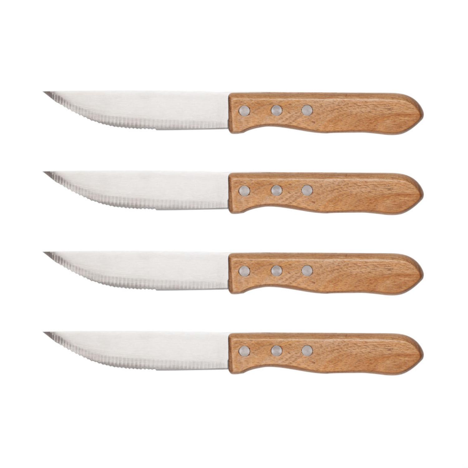 Set of hardened stainless steel 4 ¾” blade steak knives- Great for chicken, steak, turkey, veal and more- Combination of serrated and straight edge for maximum performance- Inverted blade serration edge designed for a prolonged cutting edge- Sharp blade tip for precision cutting- Triple riveted wood grain, ergonomic shaped handles- Enjoy true cuts with a real, steakhouse experience- Perfect for BBQ’s, dinner parties or the homeProduct Size: 7.125″ x 11″ x 1″. 7.125″ W x 11.0″ H x 1.0″ D