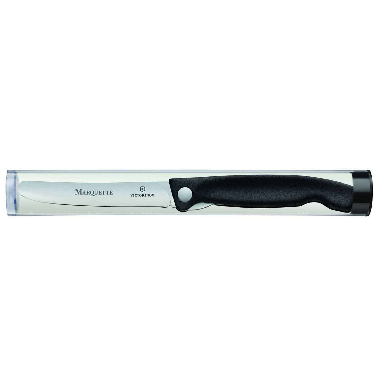 Compact folding pairing knife, ideal for peeling and chopping fruit and vegetables. 5.1″ handle. 4.3″L blade. Swiss made, with a sharp straight edge blade that folds into the handle. Laser engraved. Tube packaging. 4.3″ L